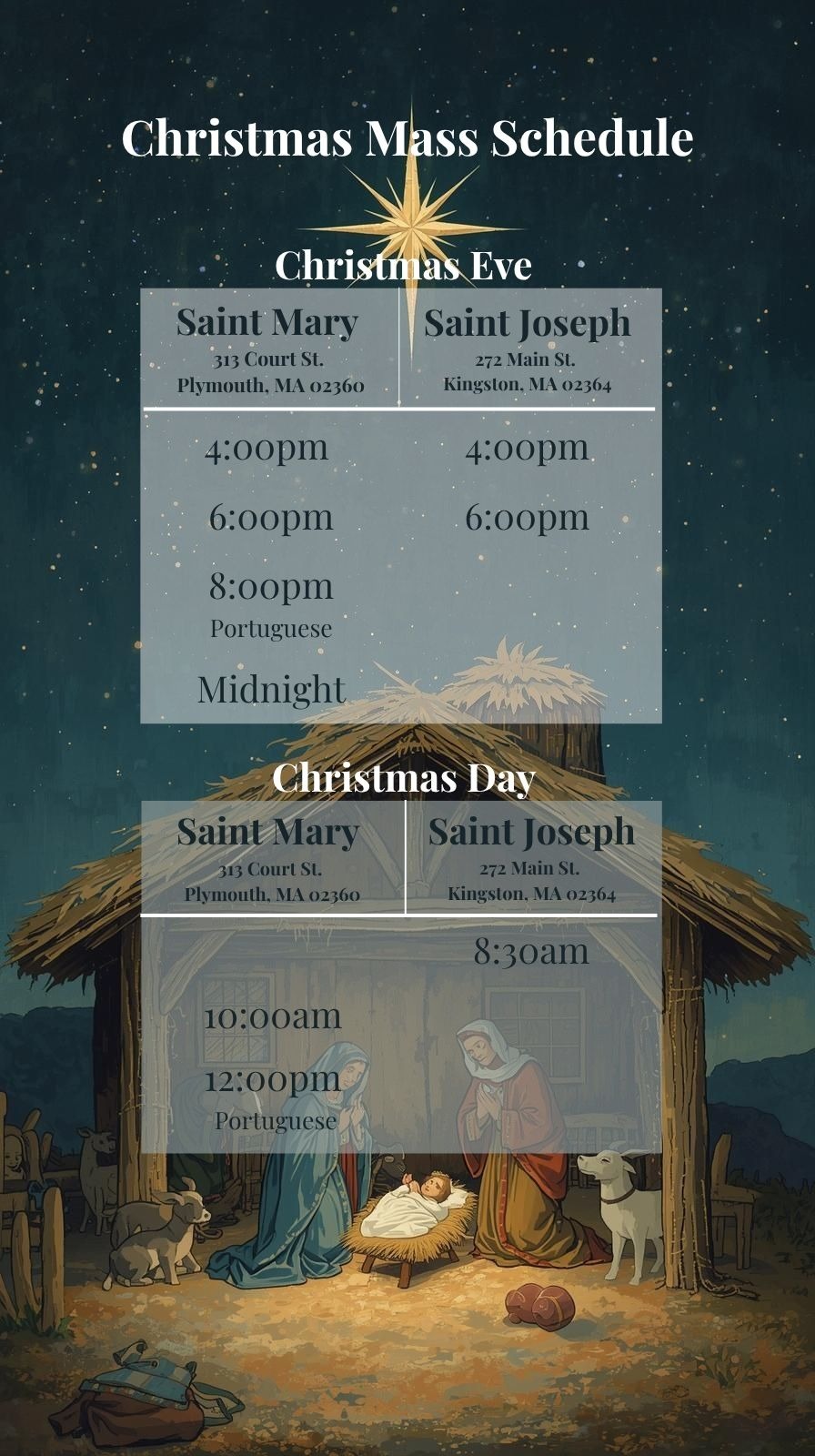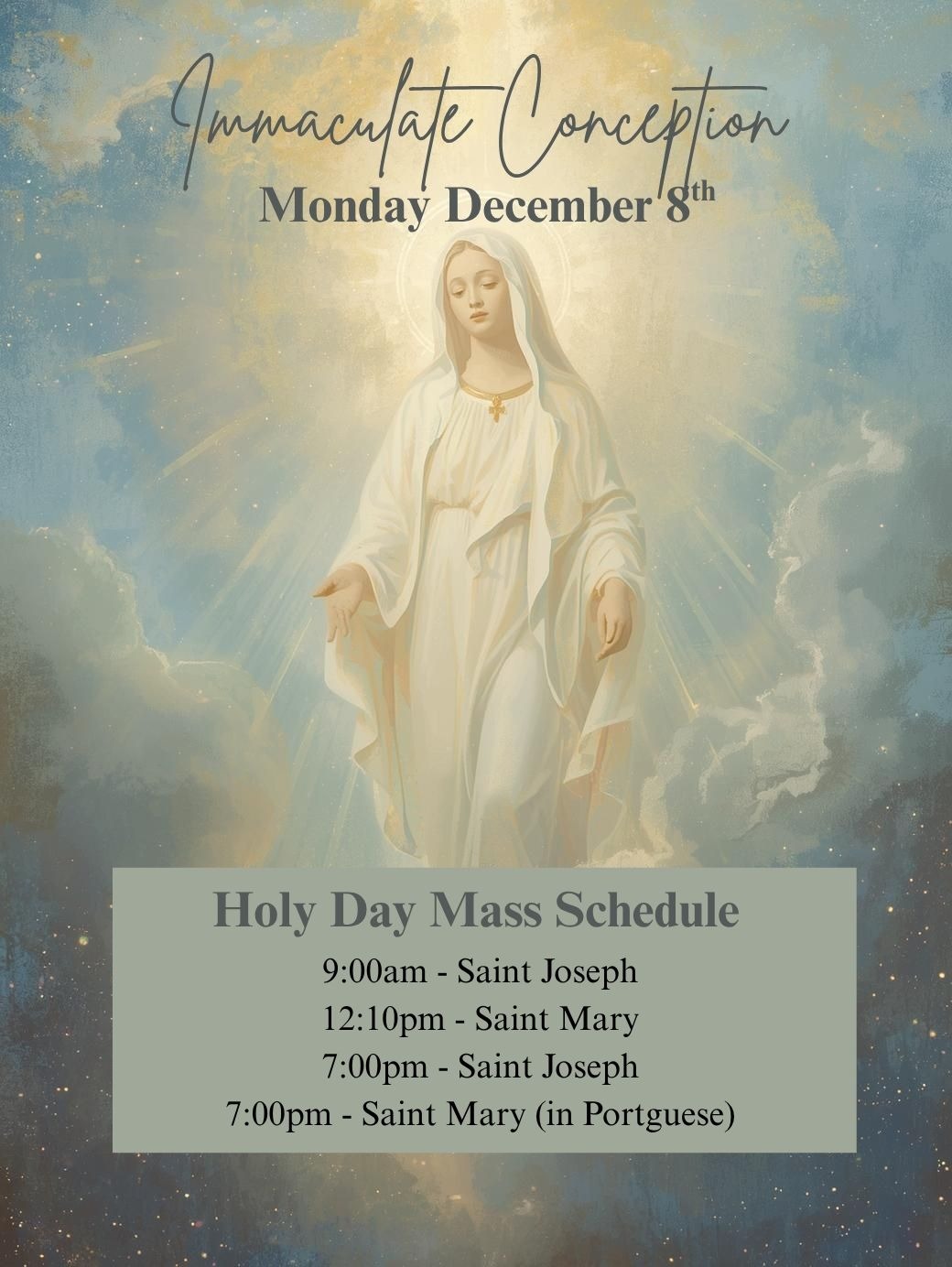 Wednesday:9:00 AMEnglishEnglishEN@ SAINT JOSEPH7:30 PMPortuguesePortuguêsPT@ SAINT MARY