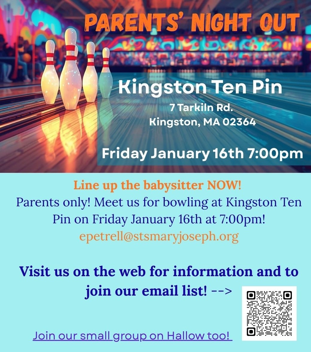 Parents Night Out is a group of parents, with children of all ages, who get together to socialize every month. It gives us an opportunity to enjoy a kid-free evening to get together to socialize and casually hang out, all being at some stage of raising our children in the Catholic faith.